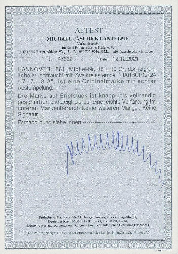 | Zusatzinformationen und Suchstichworte: | Ulrich Felzmann 175. Auktion Auktionstermin: 30. Juni 2022 Los 5063 Altdeutschland Hannover 10 Gr dunkelgrünlicholiv, tadellos knapp- bis vollrandig mit wunderschön klar aufsitzendem K2 HARBURG 24/7 sowie übergehendem Teil eines englischen Stempels in roter Farbe auf insgesamt sehr attraktivem kleinem Briefstück, Fotoattest Jäschke-L. BPP Zuschlag 225,00 EUR |