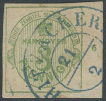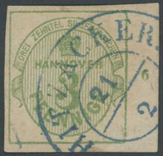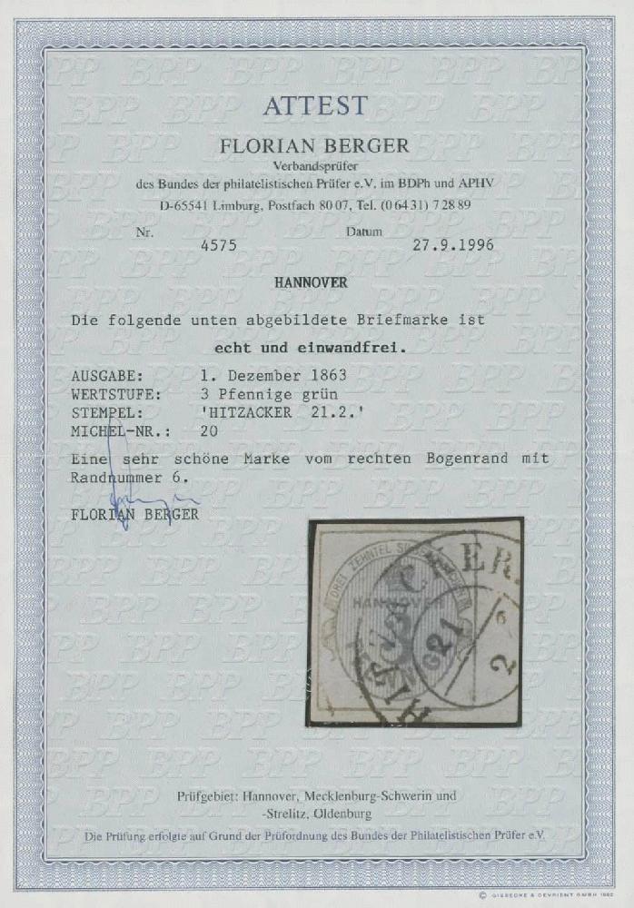 | Zusatzinformationen und Suchstichworte: | Ulrich Felzmann 175. Auktion Auktionstermin: 30. Juni 2022 Los 5065 Altdeutschland Hannover 3 Pfge grün mit klarem Teilstempel HITZACKER 21.2., herrlich farbfrisch und ringsum breitrandig mit rechtem Bogenrand und Randnummer "6", absolut fehlerfreies Luxusstück, mehrfach sign. sowie Fotoattest Berger BPP "einwandfrei" Zuschlag 1.215,00 EUR |