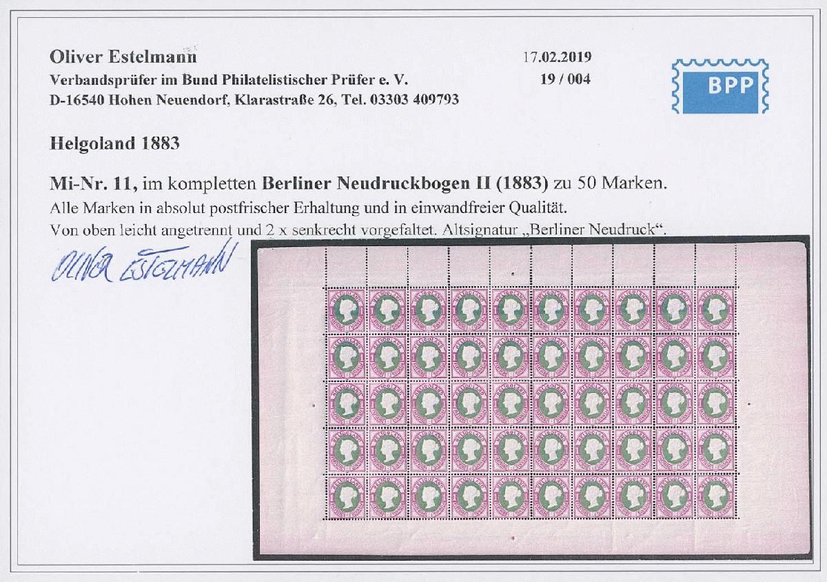 | Zusatzinformationen und Suchstichworte: | Ulrich Felzmann 175. Auktion Auktionstermin: 30. Juni 2022 Los 5066 Altdeutschland Helgoland 1 F / Pfg Berliner Neudruck 1883, komplett 50 Werte tadellos postfrisch im vollständigen Bogen, lediglich leichte Randantrennungen/Faltspuren, Randsignatur sowie Foto-Kurzbefund Estelmann BPP "... in einwandfreier Qualität" Ausruf 100,00 EUR |