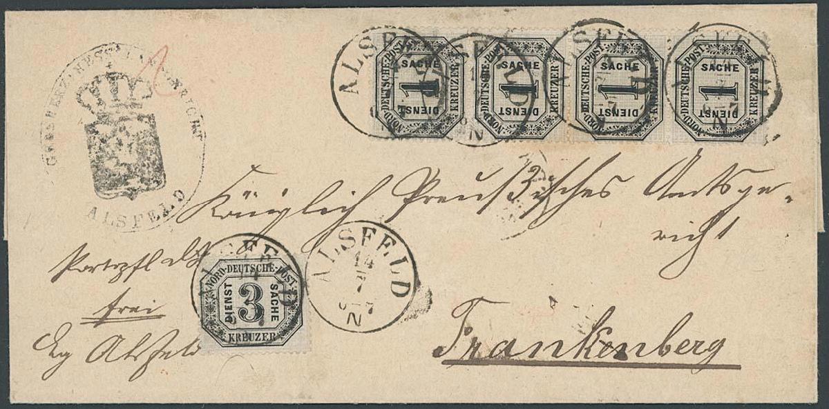 | Zusatzinformationen und Suchstichworte: | Ulrich Felzmann 175. Auktion Auktionstermin: 30. Juni 2022 Los 5135 Altdeutschland Norddeutscher Postbezirk 1 Kr im senkrechten Viererstreifen (!) in tarifrichtiger Mischfrankatur mit 3 Kr auf Faltbriefhülle ALSFELD 14/7, portopflichtige Dienstsache nach Frankenberg mit rs. Ankunft 15.7., 3 Kr kleine Eckkorrektur, darüber hinaus ursprünglich erhalten, bis auf kleine Knitter- und Tönungsspuren einwandfrei, Fotoattest Mehlmann BPP "Zurzeit die einzig bekannte Mischfrankatur mit einem Viererstreifen der 1 Kreuzer-Dienstmarke!" Zuschlag 620,00 EUR |