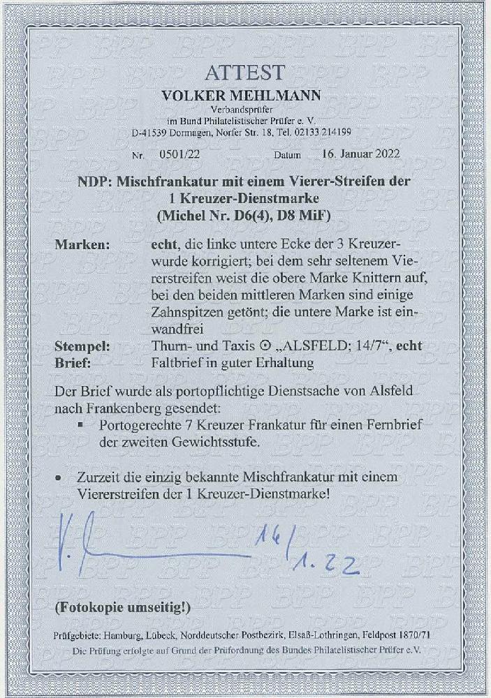 | Prüfgebiet: | Norddeutscher Postbezirk 1870 - 1871 Dienstmarken |