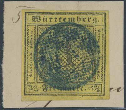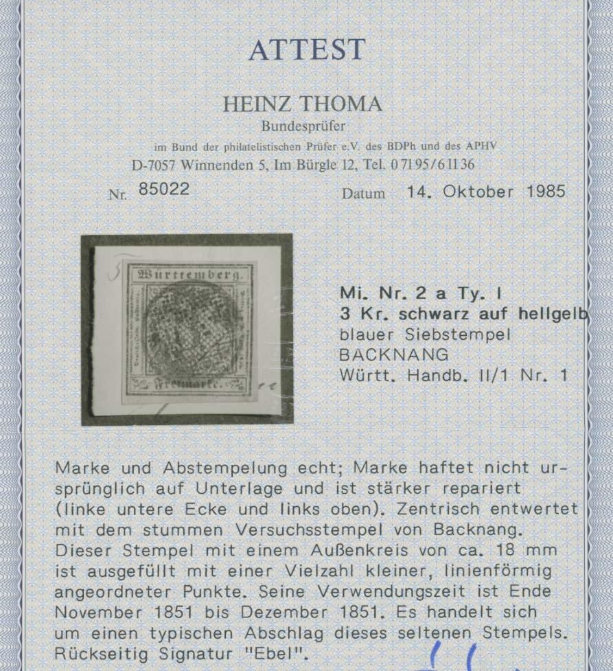 | Zusatzinformationen und Suchstichworte: | Ulrich Felzmann 175. Auktion Auktionstermin: 30. Juni 2022 Los 5123 Altdeutschland Württemberg BACKNANG, stummer blauer Siebstempel ideal zentrisch als alleinige Entwertung aus der nur zweimonatigen Verwendungszeit auf 3 Kr auf gelb, diese repariert und anschließend wieder auf Briefstück befestigt, darüber hinaus sehr attraktiv und herrlich farbfrisch, sign. Ebel sowie Fotoattest Thoma BPP Zuschlag 450,00 EUR |