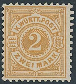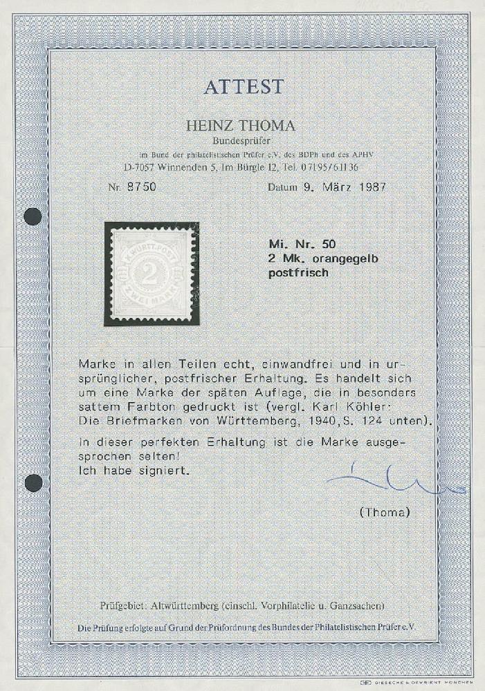 | Zusatzinformationen und Suchstichworte: | Ulrich Felzmann 175. Auktion Auktionstermin: 30. Juni 2022 Los 5129 Altdeutschland Württemberg 2 Mk dunkelgelborange in besonders sattem Farbton, vollzähnig und tadellos postfrisch mit vollem Originalgummi in übedurchschnittlich schöner Luxuserhaltung, sign. Thoma BPP mit Fotoattest "In dieser perfekten Erhaltung ist die Marke ausgesprochen selten!" sowie Fotoattest Winkler BPP "In postfrischer Erhaltung und mangelfrei wie hier ist die Marke selten" Ausruf 750,00 EUR |