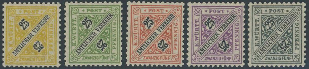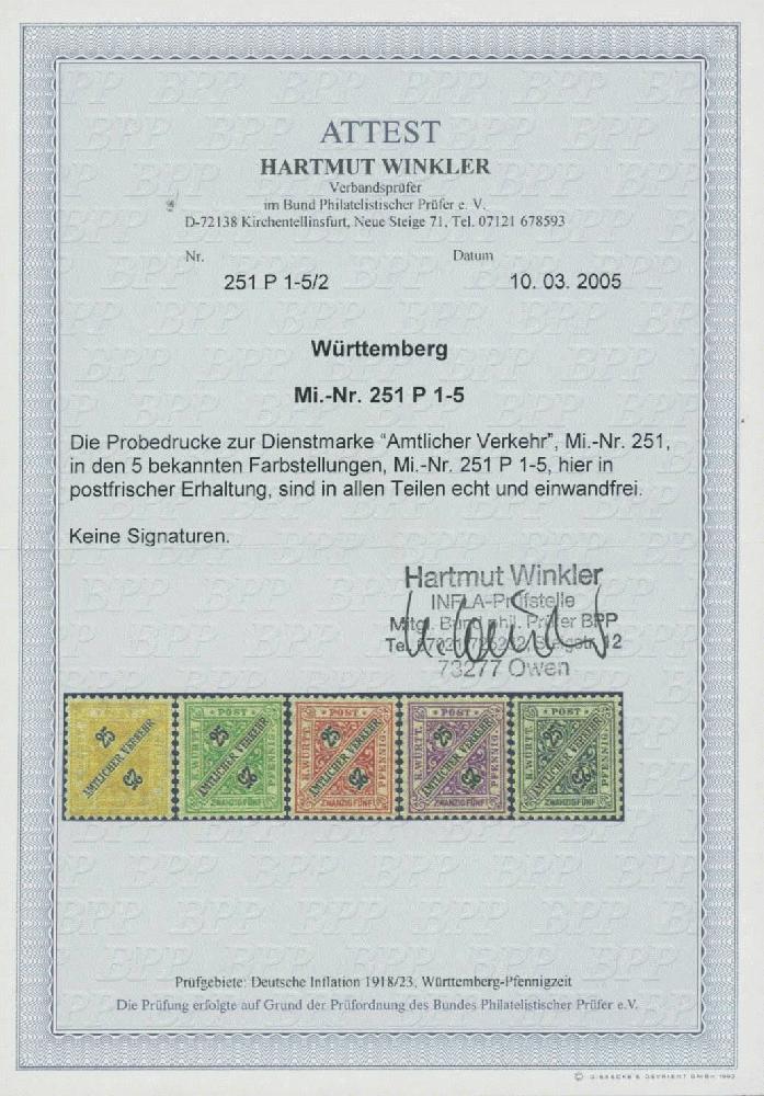 | Zusatzinformationen und Suchstichworte: | Ulrich Felzmann 175. Auktion Auktionstermin: 30. Juni 2022 Los 5133 Altdeutschland Württemberg 25 Pfg AMTLICHER VERKEHR, postfrische Luxus-Garnitur sämtlicher 5 Probedruckfarben in unsignierter Top-Erhaltung, Fotoattest Winkler BPP "... einwandfrei" Ausruf 250,00 EUR |