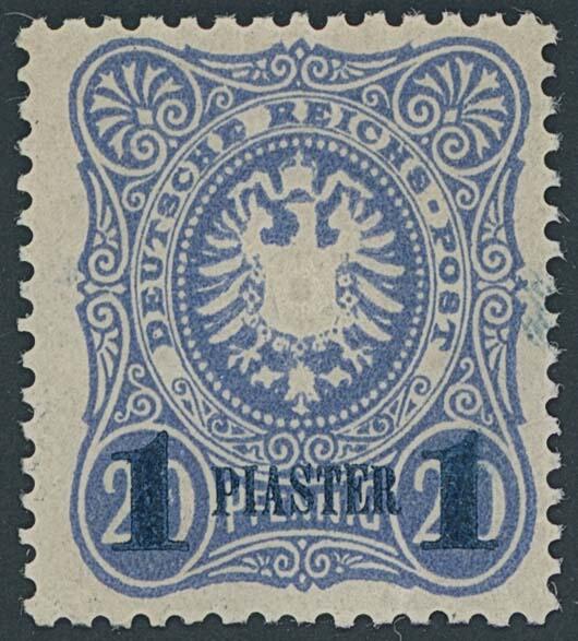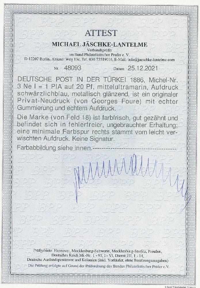 | Zusatzinformationen und Suchstichworte: | Ulrich Felzmann 175. Auktion Auktionstermin: 30. Juni 2022 Los 5388 Deutsche Auslandspost Türkei 1 PIA schwärzlichblau und metallisch glänzend auf 20 Pfg mittelultramarin, äußerst seltener Fouré-Neudruck von Feld 18 mit leicht verwischtem Aufdruck in fehlerfrei ungebrauchter, farbfrischer und gut gezähnter Prachterhaltung, Fotoattest Jäschke-L. BPP, € 3.000,- Ausruf 1.000,00 EUR |