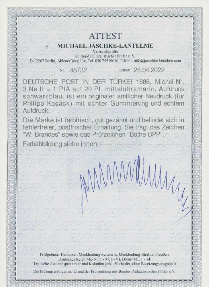 | Zusatzinformationen und Suchstichworte: | Ulrich Felzmann 175. Auktion Auktionstermin: 30. Juni 2022 Los 5389 Deutsche Auslandspost Türkei 1 PIA schwarzblau auf 20 Pfg mittelultramarin, seltener amtlicher Kosack-Neudruck in fehlerfreier, farbfrischer und gut gezähnter Luxuserhaltung, u.a. sign. Bothe BPP sowie Fotoattest Jäschke-L. BPP, € 1.500,- Ausruf 500,00 EUR |