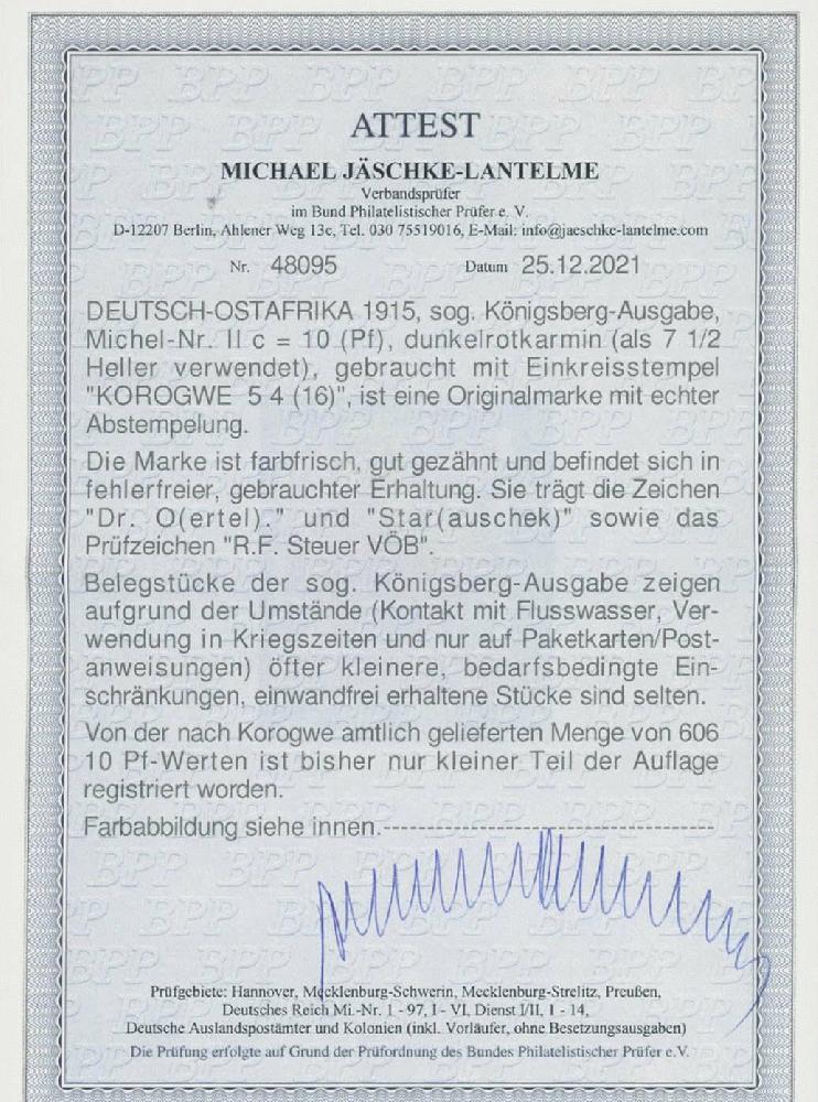 | Zusatzinformationen und Suchstichworte: | Ulrich Felzmann 175. Auktion Auktionstermin: 30. Juni 2022 Los 5414 Deutsche Kolonien Ostafrika KÖNIGSBERG-AUSGABE 1915, 10 Pfg Germania zentrisch gestempelt KOROGWE 5 4 (16) in überdurchschnittlich guter Kabinetterhaltung, farbfrisch (!) und gut gezähnt! Völlig fehlerfreies Spitzenstück der 606 Exemplare, die dem Postamt Korogwe geliefert wurden, wovon bislang jedoch nur ein kleiner Teil registriert ist, sign. Dr. Oertel, Starauschek und R.F. Steuer sowie ausführliches Fotoattest Jäschke-L. BPP Zuschlag 1.200,00 EUR |