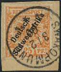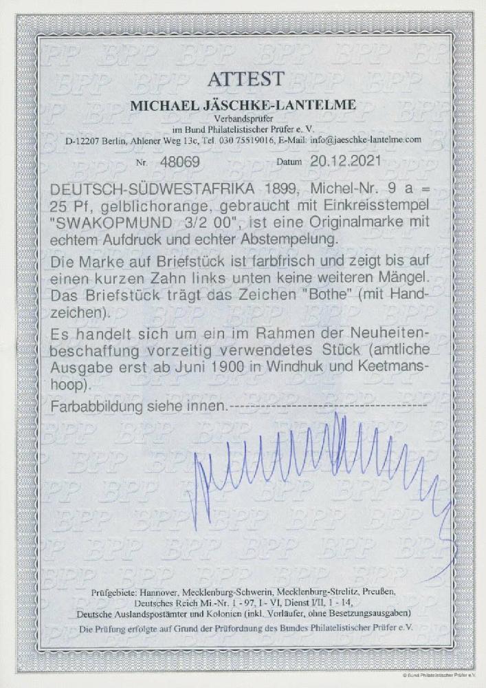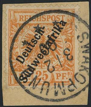 | Zusatzinformationen und Suchstichworte: | Ulrich Felzmann 175. Auktion Auktionstermin: 30. Juni 2022 Los 5424 Deutsche Kolonien Südwestafrika 25 Pfg Krone/Adler gelblichorange mit seltener Früh-Entwertung SWAKOPMUND 3/2 00 auf kleinem Briefstück, bis auf einen kurzen Zahn tadellos erhalten, farbfrisch und sehr schön klar entwertet, sign. Bothe sowie Fotoattest Jäschke-L. BPP, € 1.300,- Zuschlag 170,00 EUR |