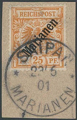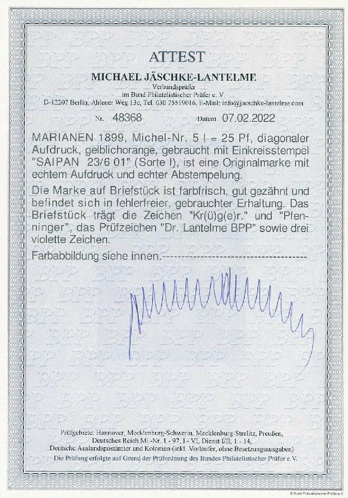 | Zusatzinformationen und Suchstichworte: | Ulrich Felzmann 175. Auktion Auktionstermin: 30. Juni 2022 Los 5483 Deutsche Kolonien Marianen 25 Pfg Krone/Adler Diagonalaufdruck, mit schön klar aufsitzendem, zeitgerechtem (!) Stempel SAIPAN 23/6 01 in Sorte I auf Briefstück, mehrfach signiert sowie Fotoatteste Dr. Lantelme und Jäschke-L. BPP, € 3.200,- Zuschlag 900,00 EUR |