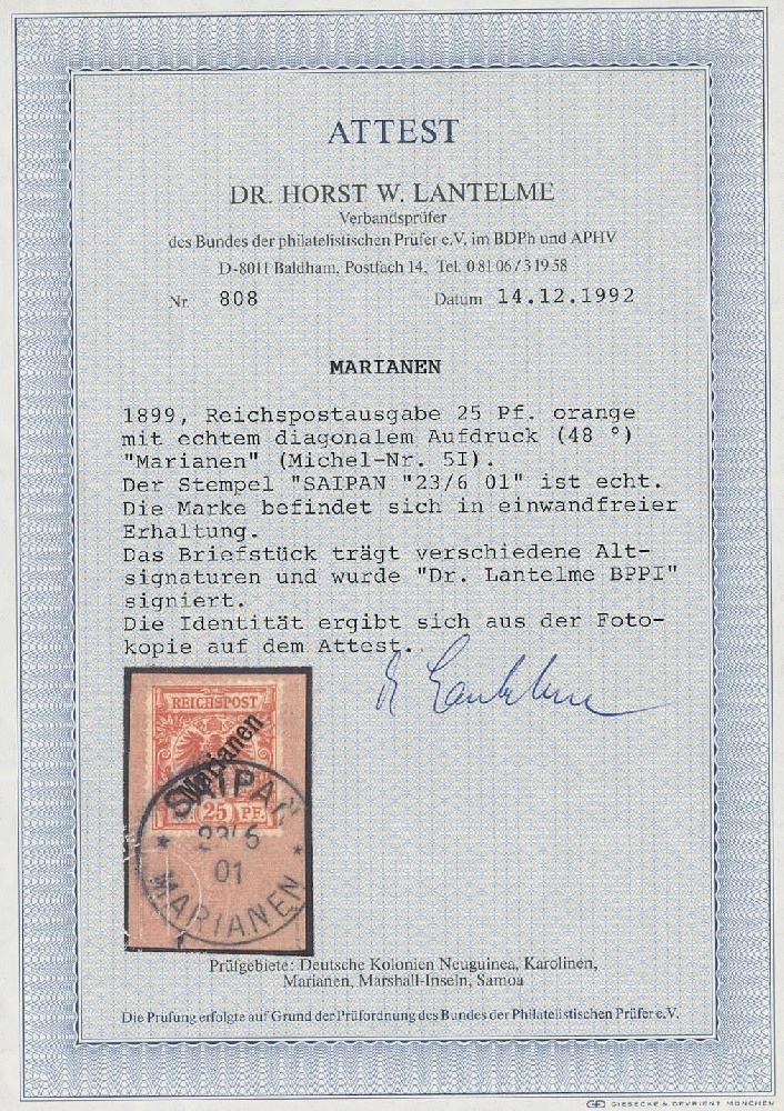 | Zusatzinformationen und Suchstichworte: | Ulrich Felzmann 175. Auktion Auktionstermin: 30. Juni 2022 Los 5483 Deutsche Kolonien Marianen 25 Pfg Krone/Adler Diagonalaufdruck, mit schön klar aufsitzendem, zeitgerechtem (!) Stempel SAIPAN 23/6 01 in Sorte I auf Briefstück, mehrfach signiert sowie Fotoatteste Dr. Lantelme und Jäschke-L. BPP, € 3.200,- Zuschlag 900,00 EUR |