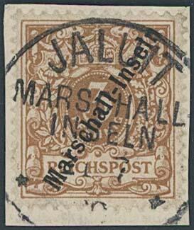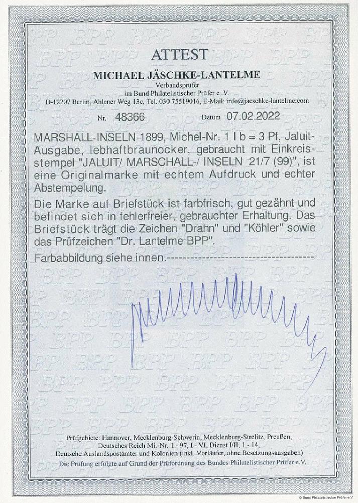 | Zusatzinformationen und Suchstichworte: | Ulrich Felzmann 175. Auktion Auktionstermin: 30. Juni 2022 Los 5486 Deutsche Kolonien Marshall Inseln Jaluit-Ausgabe 3 Pfg Krone/Adler lebhaftbraunocker, zentrisch entwertet mit 1. Stempel JALUIT 21/7 (99), farbfrisch und gut gezähnt auf kleinem Briefstück, signiert Drahn, Köhler, Dr. Lantelme BPP sowie Fotoattest Jäschke-L. BPP, € 2.600,- Zuschlag 640,00 EUR |