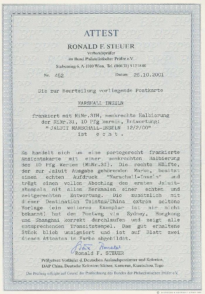 | Zusatzinformationen und Suchstichworte: | Ulrich Felzmann 175. Auktion Auktionstermin: 30. Juni 2022 Los 5488 Deutsche Kolonien Marshall Inseln HALBIERUNG 10 Pfg Krone/Adler "Jaluit-Ausgabe", tadellos erhaltene rechte Hälfte in zeitgerechter Verwendung als 5 Pfg Notfrankatur mit erstem Stempel 12/2 00 auf bildschöner Ansichtskarte "S.M.S. Seeadler" mit Text, mit deutscher Kolonial-Destination nach Tsintau in China mit vs. Durchgangsstempel SYDNEY 2.4., bildseitig HONG-KONG 28.4. sowie vs. SHANGHAI D.P. 2.5, hervorragend erhalten mit üblichen Beförderungsspuren und gemäß Fotoattesten R. Steuer sowie Jäschke-L. BPP in dieser Kombination einzig bekanntes Stück - Erstmals 1952 auf einer Versteigerung angebotene große Kolonial-Rarität Ausruf 10.000,00 EUR |