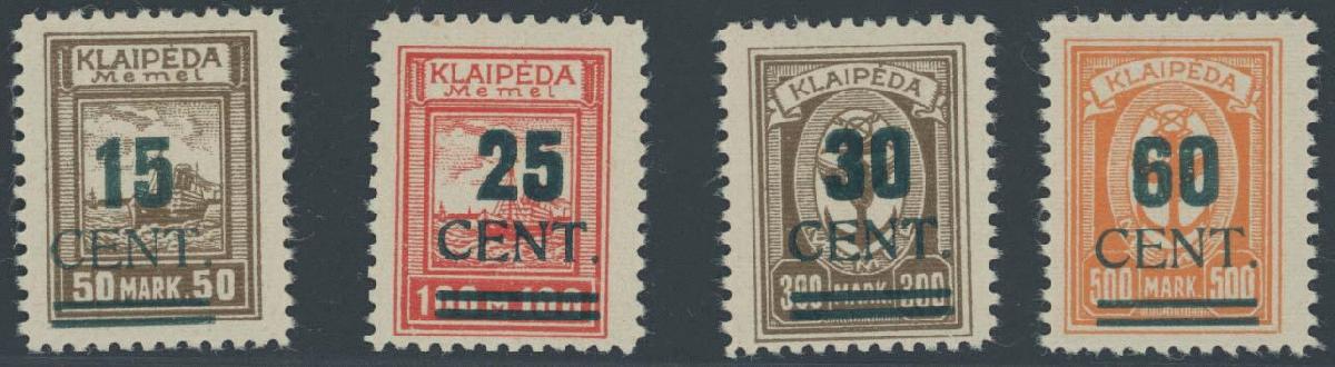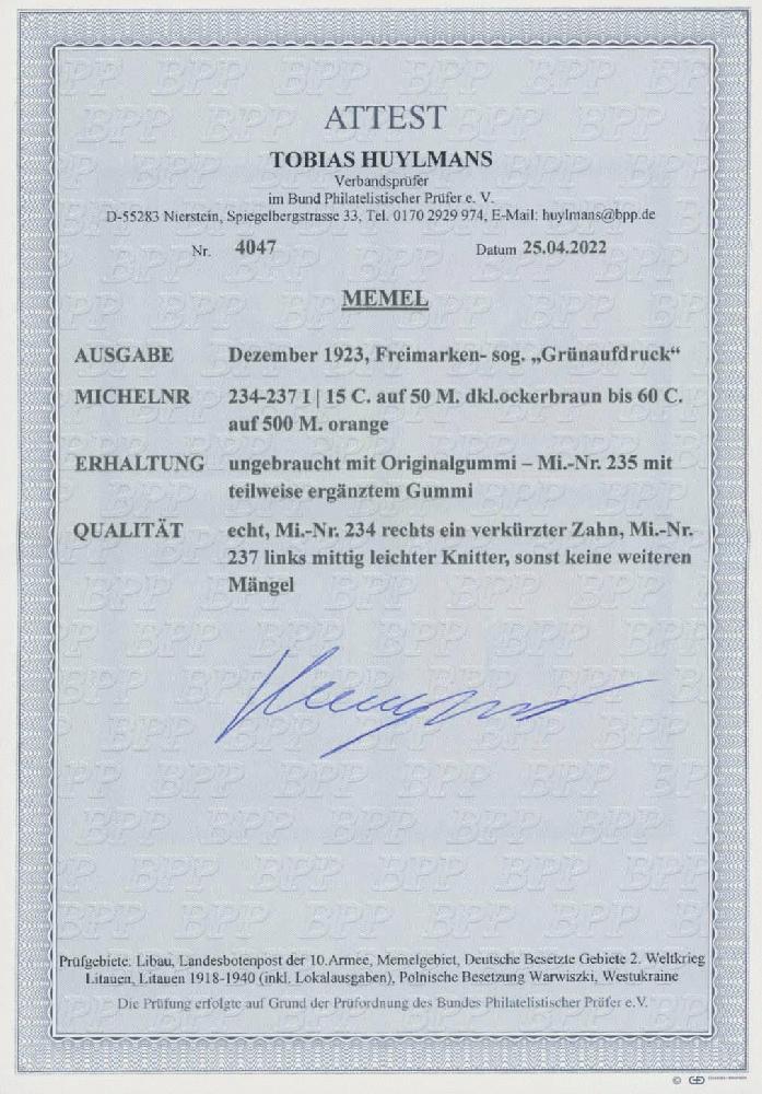 | Zusatzinformationen und Suchstichworte: | Ulrich Felzmann 175. Auktion Auktionstermin: 30. Juni 2022 Los 5604 Memel Grünaufdruck in Type I, komplett 4 Werte ungebraucht mit geringen Einschränkungen gemäß Fotoattest Huylmans BPP, € 750,- Zuschlag 140,00 EUR |