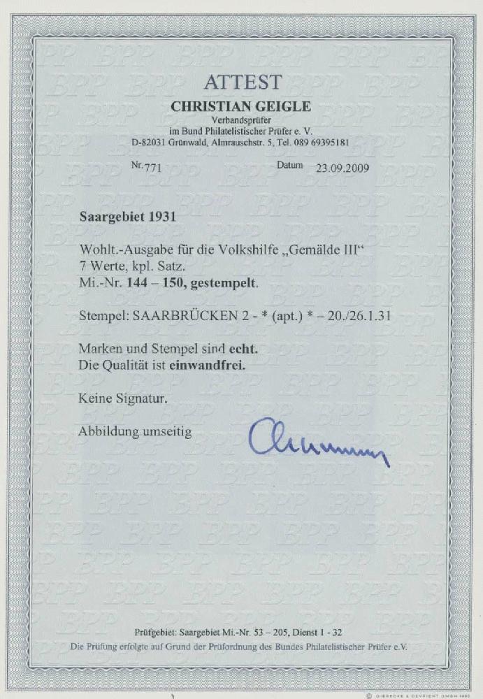 | Zusatzinformationen und Suchstichworte: | Ulrich Felzmann 175. Auktion Auktionstermin: 30. Juni 2022 Los 5608 Saargebiet Volkshilfe 1931 komplett gestempelt, Fotoattest Geigle BPP "... einwandfrei", € 650,- Zuschlag 180,00 EUR |