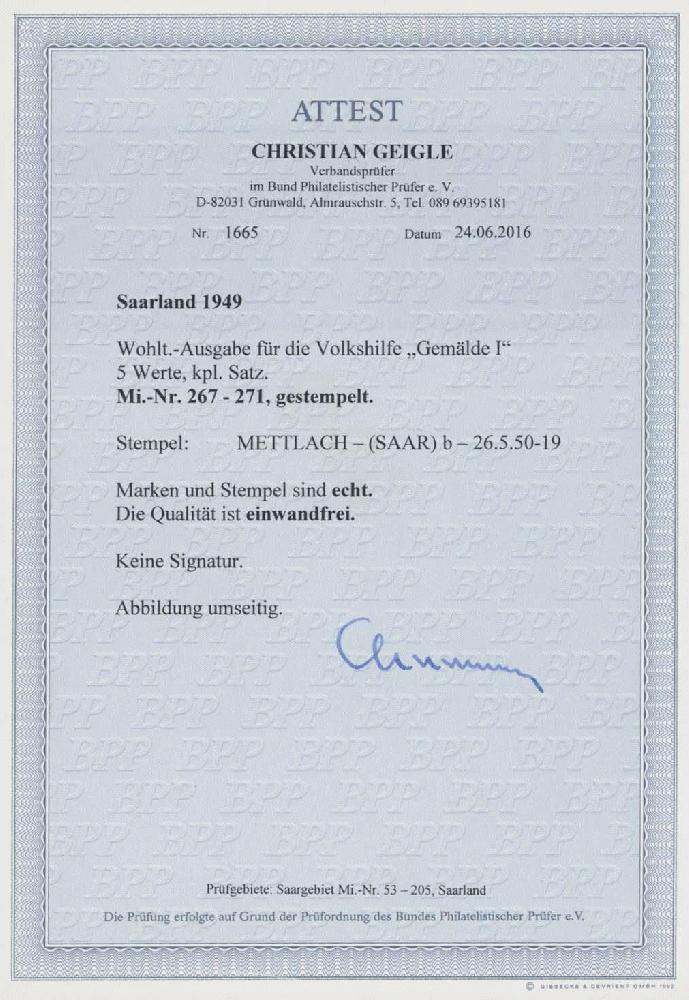 | Zusatzinformationen und Suchstichworte: | Ulrich Felzmann 175. Auktion Auktionstermin: 30. Juni 2022 Los 5614 Saargebiet Volkshilfe 1949 komplett gestempelt, Fotoattest Geigle BPP "... einwandfrei", € 650,- Zuschlag 135,00 EUR |