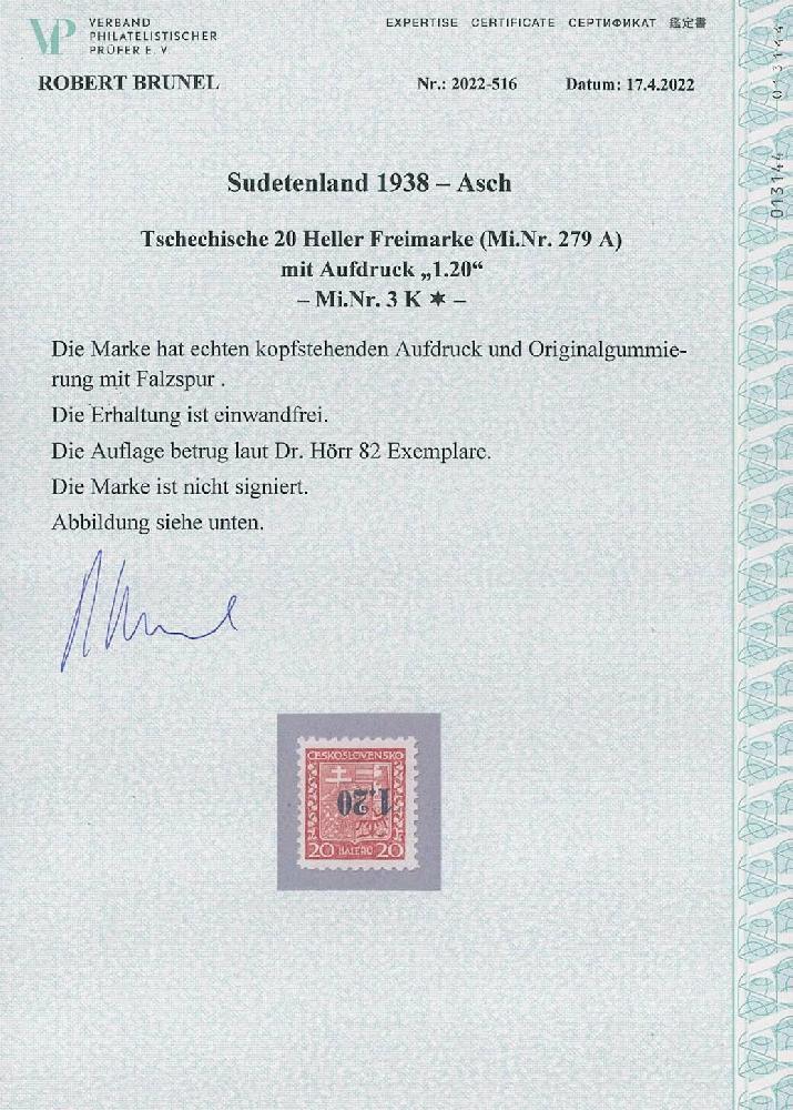 | Zusatzinformationen und Suchstichworte: | Ulrich Felzmann 175. Auktion Auktionstermin: 30. Juni 2022 Los 5632 Sudetenland Asch 1.20 auf 20 H Wappen mit kopfstehendem Aufdruck, ungebraucht mit praktisch unmerklichen Haftspuren im Bereich der unteren Zahnspitzen in darüber hinaus tadelloser, unsignierter (!) Prachterhaltung, Fotoattest Brunel "... einwandfrei", € 240,- Zuschlag 90,00 EUR |