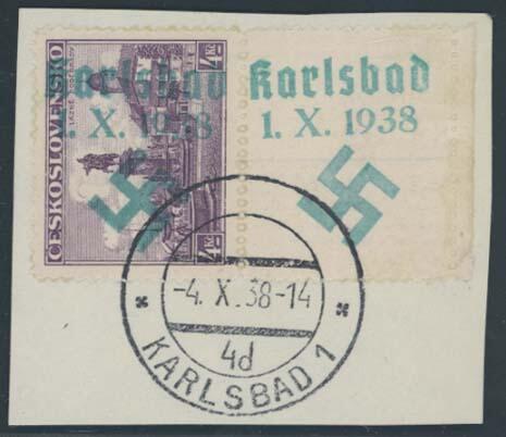 | Zusatzinformationen und Suchstichworte: | Ulrich Felzmann 175. Auktion Auktionstermin: 30. Juni 2022 Los 5653 Sudetenland Karlsbad 4 Kc Podiebrad mit unten anhängendem, ebenfalls überdrucktem Leerfeld sowie kleinem Bogenrand, mit zentrisch aufsitzendem aptiertem Stempel KARLSBAD 1 4d 4.X.38 auf tadellosem Pracht-Briefstück, sign. Mahr BPP sowie Fotoattest Brunel "... einwandfrei ... äußerst selten", € 1.000,- Zuschlag 460,00 EUR |