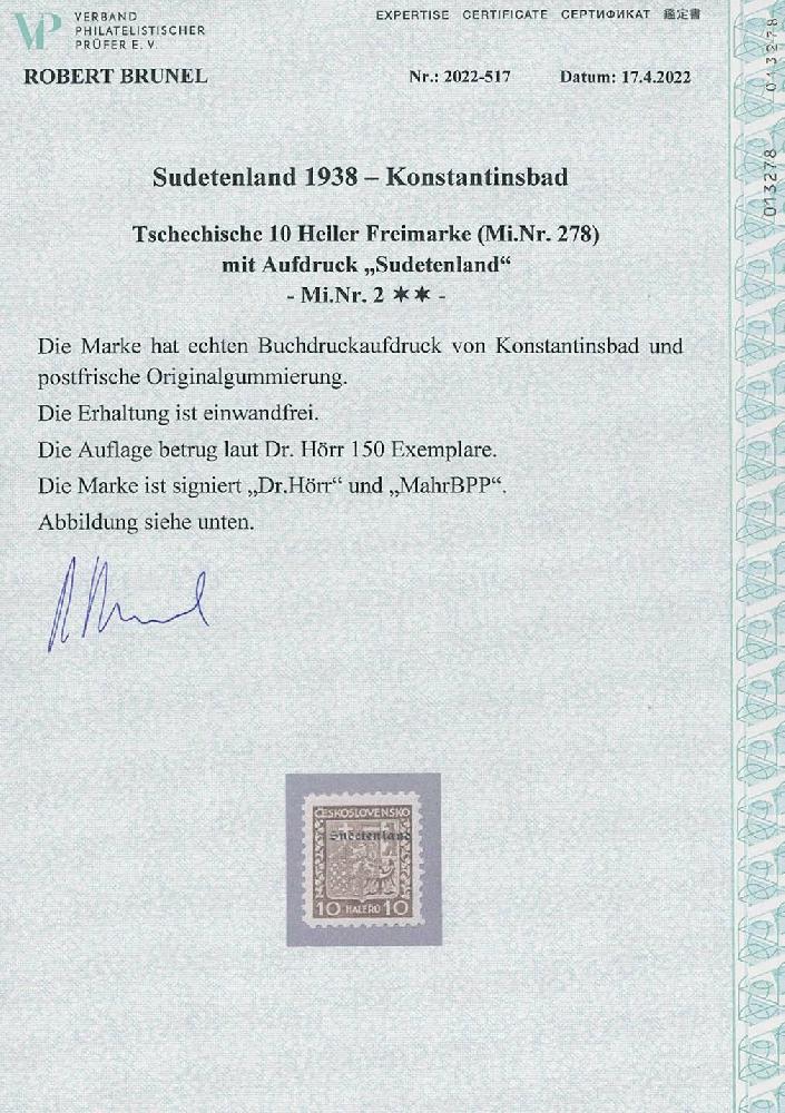| Zusatzinformationen und Suchstichworte: | Ulrich Felzmann 175. Auktion Auktionstermin: 30. Juni 2022 Los 5708 Sudetenland Konstantinsbad 10 H Wappen in tadellos postfrischer (!) Prachterhaltung, sign. Dr. Hörr und Mahr BPP sowie Fotoattest Brunel "... einwandfrei", € 500,- Zuschlag 310,00 EUR |