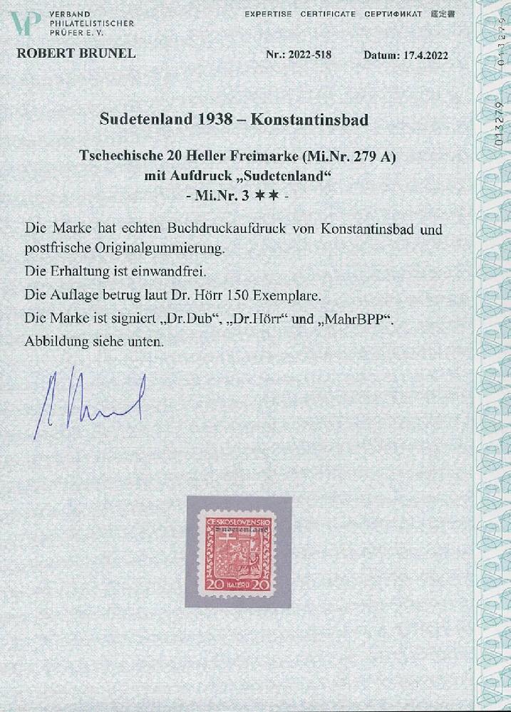| Zusatzinformationen und Suchstichworte: | Ulrich Felzmann 175. Auktion Auktionstermin: 30. Juni 2022 Los 5709 Sudetenland Konstantinsbad 20 H Wappen in tadellos postfrischer (!) Prachterhaltung, u.a. sign. Dr. Hörr und Mahr BPP sowie Fotoattest Brunel "... einwandfrei", € 500,- Zuschlag 310,00 EUR |