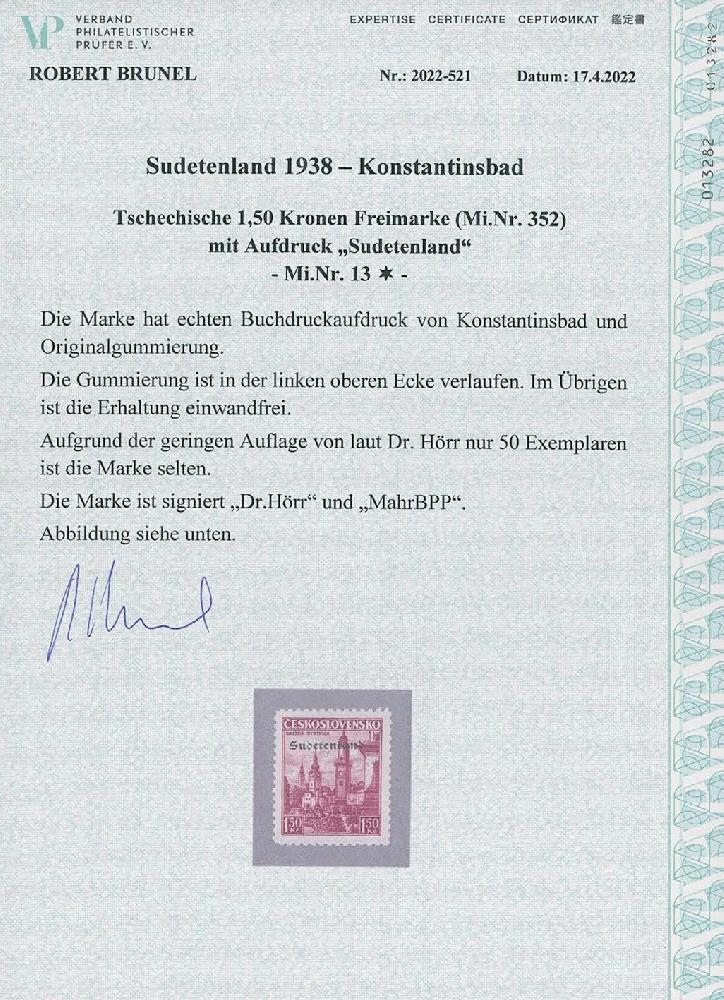 | Zusatzinformationen und Suchstichworte: | Ulrich Felzmann 175. Auktion Auktionstermin: 30. Juni 2022 Los 5719 Sudetenland Konstantinsbad 1.50 Kc Neusohl ungebraucht mit lediglich etwas verlaufener Gummierung in tadellos vollzähniger Prachterhaltung, sign. Dr. Hörr und Mahr BPP sowie Fotoattest Brunel "... einwandfrei ... selten" - Auflage nur 50 Exemplare, € 1.400,- Zuschlag 450,00 EUR |