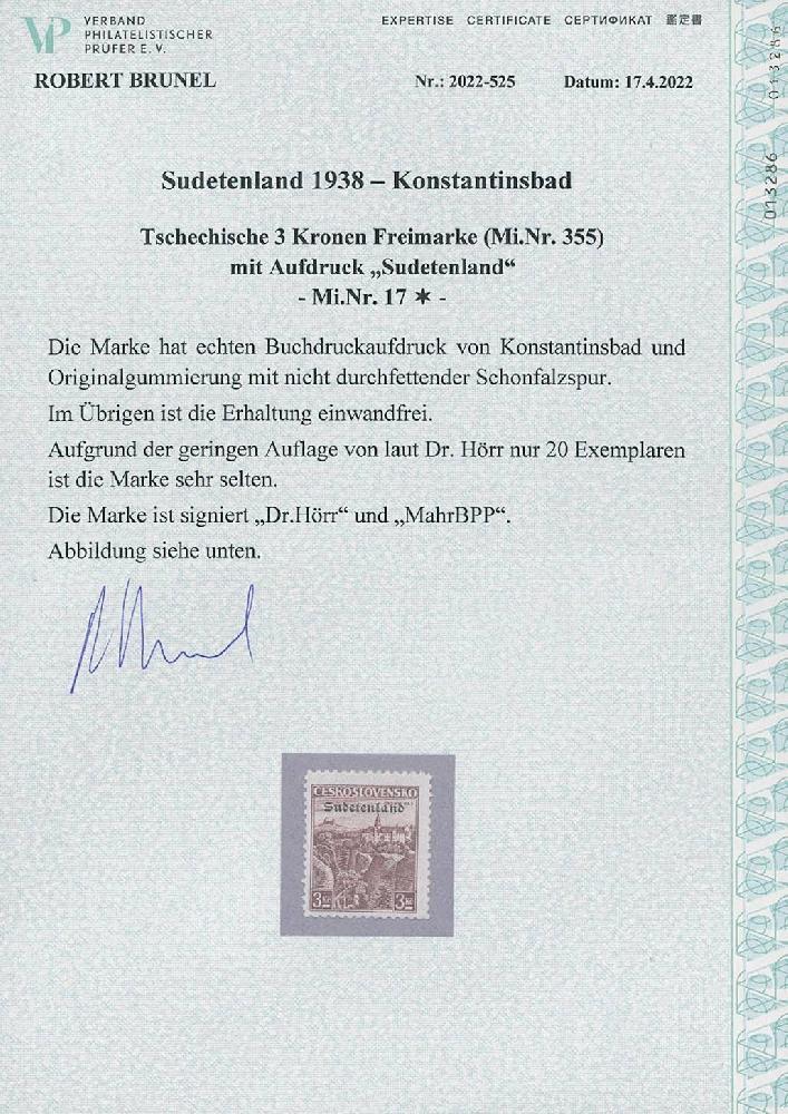 | Zusatzinformationen und Suchstichworte: | Ulrich Felzmann 175. Auktion Auktionstermin: 30. Juni 2022 Los 5723 Sudetenland Konstantinsbad 3 Kc Groß-Skal ungebraucht mit besonders leichter, nicht durchschlagender Schonfalzspur in tadellos vollzähniger Prachterhaltung, sign. Dr. Hörr und Mahr BPP sowie Fotoattest Brunel "Im übrigen ist die Erhaltung einwandfrei ... sehr selten" - Auflage nur 20 Exemplare, € 4.500,- Zuschlag 1.500,00 EUR |