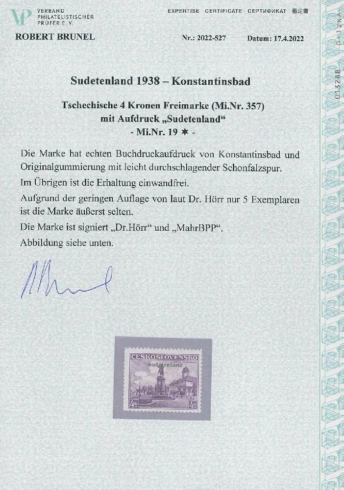 | Zusatzinformationen und Suchstichworte: | Ulrich Felzmann 175. Auktion Auktionstermin: 30. Juni 2022 Los 5726 Sudetenland Konstantinsbad 4 Kc Bad Podiebrad ungebraucht mit lediglich leichter, kaum durchschlagender Schonfalzspur in darüber hinaus tadellos vollzähniger Prachterhaltung, sign. Dr. Hörr und Mahr BPP sowie Fotoattest Brunel "... äußerst selten" - Angesichts der Minimal-Auflage von nur 5 Exemplaren eine der Spitzen-Raritäten des Sudetenlandes, € 16.000,- Zuschlag 4.400,00 EUR |