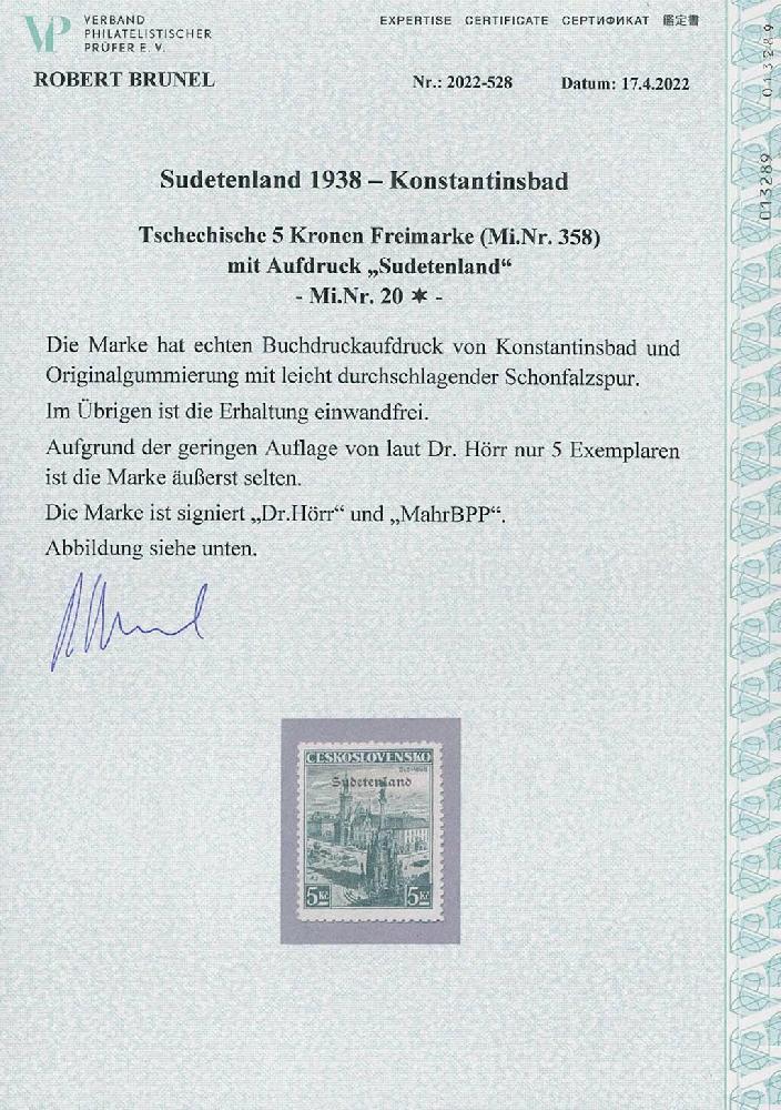 | Zusatzinformationen und Suchstichworte: | Ulrich Felzmann 175. Auktion Auktionstermin: 30. Juni 2022 Los 5727 Sudetenland Konstantinsbad 5 Kc Olmütz ungebraucht mit lediglich leichter, kaum durchschlagender Schonfalzspur in darüber hinaus tadellos vollzähniger Prachterhaltung, sign. Dr. Hörr und Mahr BPP sowie Fotoattest Brunel "... äußerst selten" - Angesichts der Minimal-Auflage von nur 5 Exemplaren eine der Spitzen-Raritäten des Sudetenlandes, € 16.000,- Zuschlag 4.600,00 EUR |