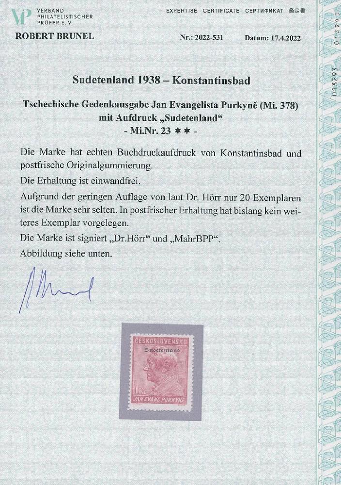 | Zusatzinformationen und Suchstichworte: | Ulrich Felzmann 175. Auktion Auktionstermin: 30. Juni 2022 Los 5731 Sudetenland Konstantinsbad 1 Kc Purkyne tadellos postfrisch (!) in vollzähniger Spitzen-Erhaltung, sign. Dr. Hörr und Mahr BPP sowie Fotoattest Brunel "... einwandfrei ... sehr selten. In postfrischer Erhaltung hat bislang kein weiteres Exemplar vorgelegen" - Angesichts der geringen Auflage von nur 20 Exemplaren ein offensichtlich einmaliges Top-Stück Zuschlag 5.400,00 EUR |