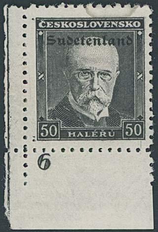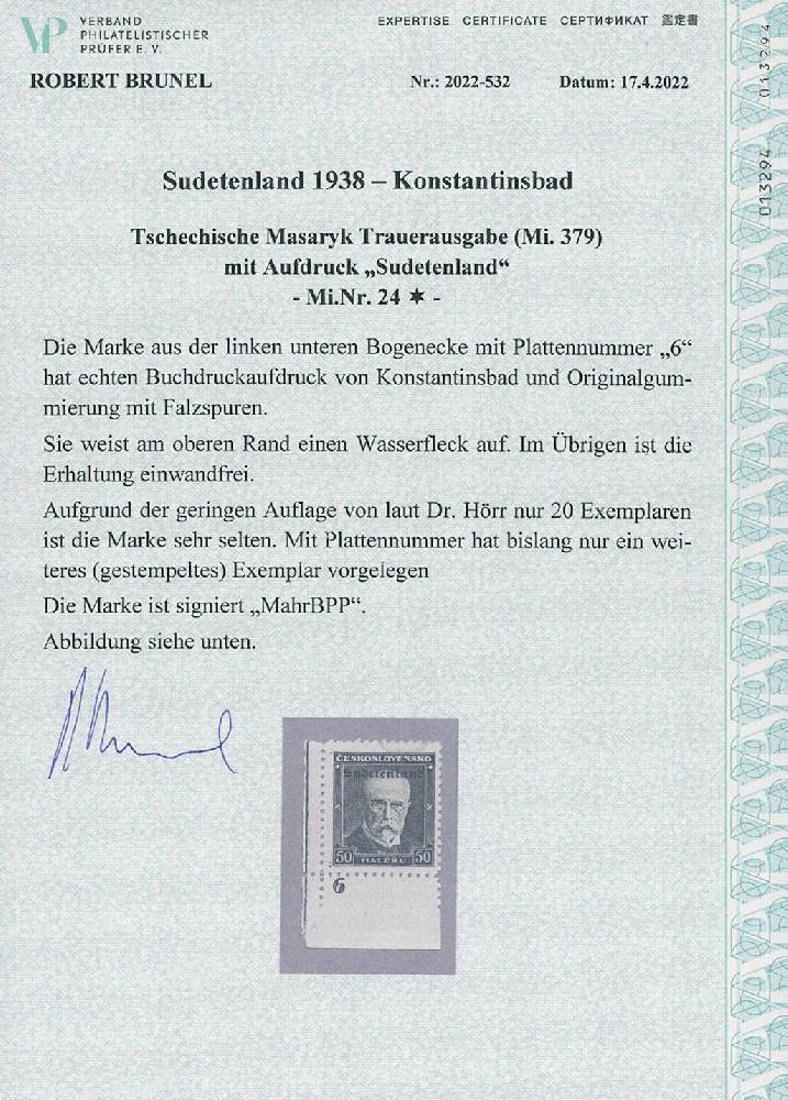 | Zusatzinformationen und Suchstichworte: | Ulrich Felzmann 175. Auktion Auktionstermin: 30. Juni 2022 Los 5732 Sudetenland Konstantinsbad 50 H Masaryk Trauer, ungefaltete linke untere Bogenecke mit Plattennummer "6" (!) sauber ungebraucht mit lediglich kleinem Wasserfleck im Oberrand, darüber hinaus einwandfrei und tadellos vollzähnig, sign. Mahr BPP sowie Fotoattest Brunel "... sehr selten. Mit Plattennummer hat bislang nur ein weiteres (gestempeltes) Exemplar vorgelegen" Zuschlag 1.500,00 EUR |
