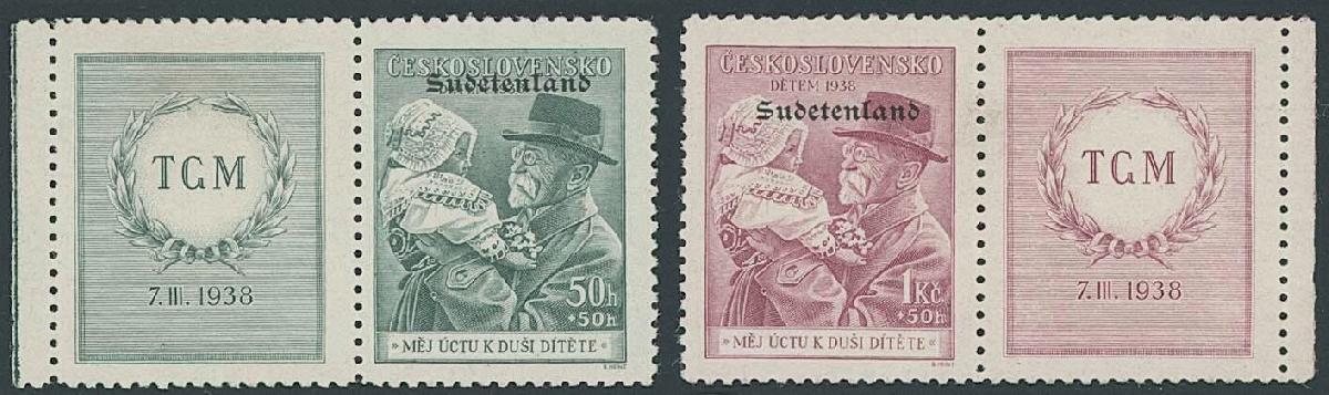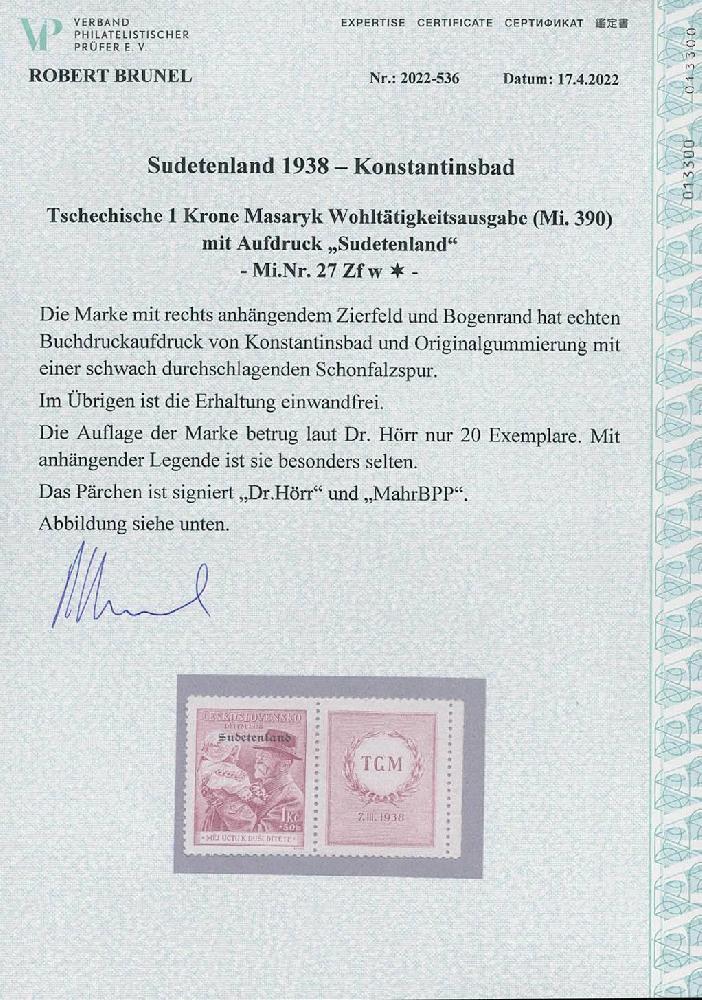 | Zusatzinformationen und Suchstichworte: | Ulrich Felzmann 175. Auktion Auktionstermin: 30. Juni 2022 Los 5735 Sudetenland Konstantinsbad 50 H und 1 Kc Masaryk mit Kind mit links bzw. rechts anhängendem, unüberdrucktem Ziefeld sowie kleinem Bogenrand, beide ungebraucht mit leichter, nur schwach durchschlagender Schonfalzspur, zudem beim 50 H Wert nur auf dem Zierfeld, so dass die Marke selbst einwandfrei postfrisch (!) erhalten ist, beide Pärchen tadellos vollzähnig und je sign. Dr. Hörr und Mahr BPP mit Einzel-Fotoattesten Brunel "... besonders selten" - Angesichts der geringen Auflage von nur jeweils 20 Exemplaren mit anhängender Legende in kompletter Garnitur eine Spitzen-Rarität des gesamten Sudetenlandes Zuschlag 10.000,00 EUR |