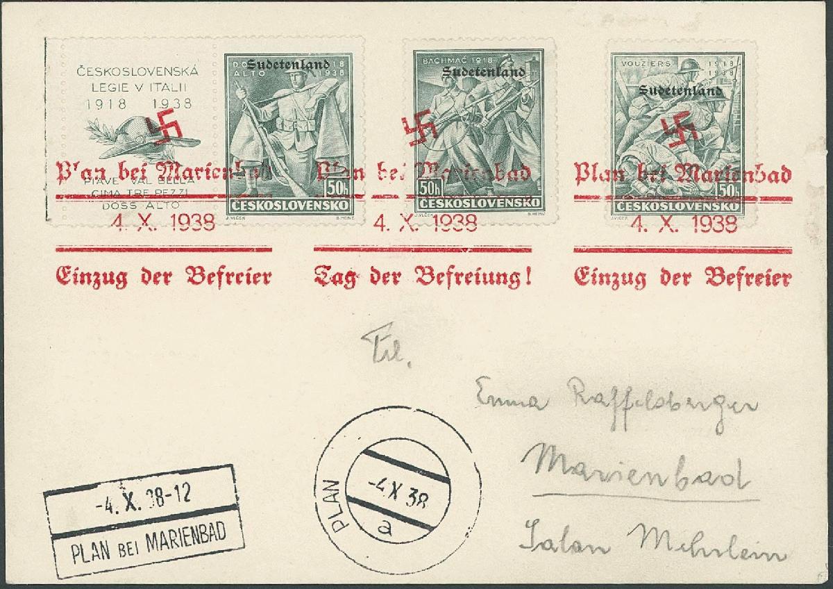 | Zusatzinformationen und Suchstichworte: | Ulrich Felzmann 175. Auktion Auktionstermin: 30. Juni 2022 Los 5737 Sudetenland Konstantinsbad Alle drei Legionärsmarken komplett und attraktiv in Reihe geklebt auf adressierter Karte ohne Text, äußerst wirkungsvoll mit deutlich kontrastierenden Befreiungs-SST "Plan bei Marienbad / 4.X.1938 / Einzug der Befreier" bzw. "... Tag der Befreiung!" in leuchtend roter Farbe sowie weiteren Nebenstempeln, Doss Alto zudem mit links anhängendem Zierfeld sowie kleinem Bogenrand, alle tadellos und rs. einzeln sign. Mahr BPP sowie Fotoattest Brunel "... einwandfrei ... sehr selten" Zuschlag 4.600,00 EUR |