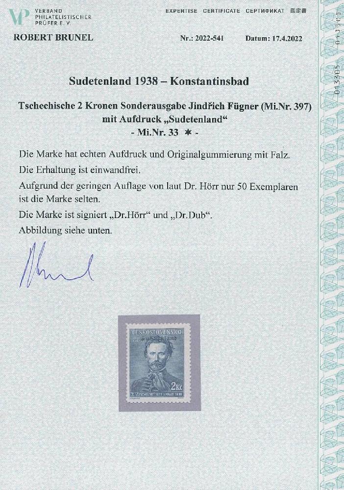 | Zusatzinformationen und Suchstichworte: | Ulrich Felzmann 175. Auktion Auktionstermin: 30. Juni 2022 Los 5740 Sudetenland Konstantinsbad 2 Kc Fügner sauber ungebraucht in vollzähniger Prachterhaltung, u.a. sign. Dr. Hörr sowie Fotoattest Brunel "... einwandfrei" - Auflage nur 50 Exemplare, € 1.500,- Zuschlag 520,00 EUR |