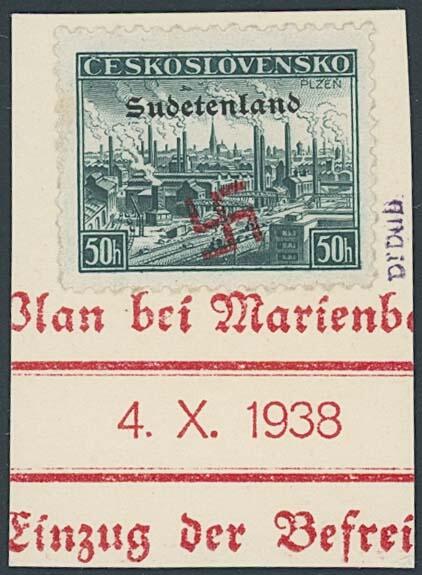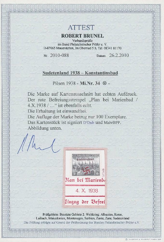 | Zusatzinformationen und Suchstichworte: | Ulrich Felzmann 175. Auktion Auktionstermin: 30. Juni 2022 Los 5741 Sudetenland Konstantinsbad 50 H Pilsen mit kontrastreichem, rotem Befreiungsstempel "Plan bei Marienbad" 4.X.1938 auf attraktivem Liebhaber-Briefstück, u.a. sign. Mahr BPP sowie Fotoattest Brunel BPP "... einwandfrei" - Abbildungsstück im Handbuch Späth, 2019, S. 149, Auflage nur 100 Exemplare Zuschlag 480,00 EUR |