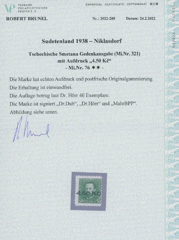 | Zusatzinformationen und Suchstichworte: | Ulrich Felzmann 175. Auktion Auktionstermin: 30. Juni 2022 Los 5760 Sudetenland Niklasdorf 4.50 Kc auf 50 H Smetana postfrisch (!) in tadellos vollzähniger Luxuserhaltung, u.a. sign. Dr. Hörr und Mahr BPP sowie Fotoattest Brunel " ... einwandfrei" - Auflage nur 40 Exemplare Zuschlag 850,00 EUR |