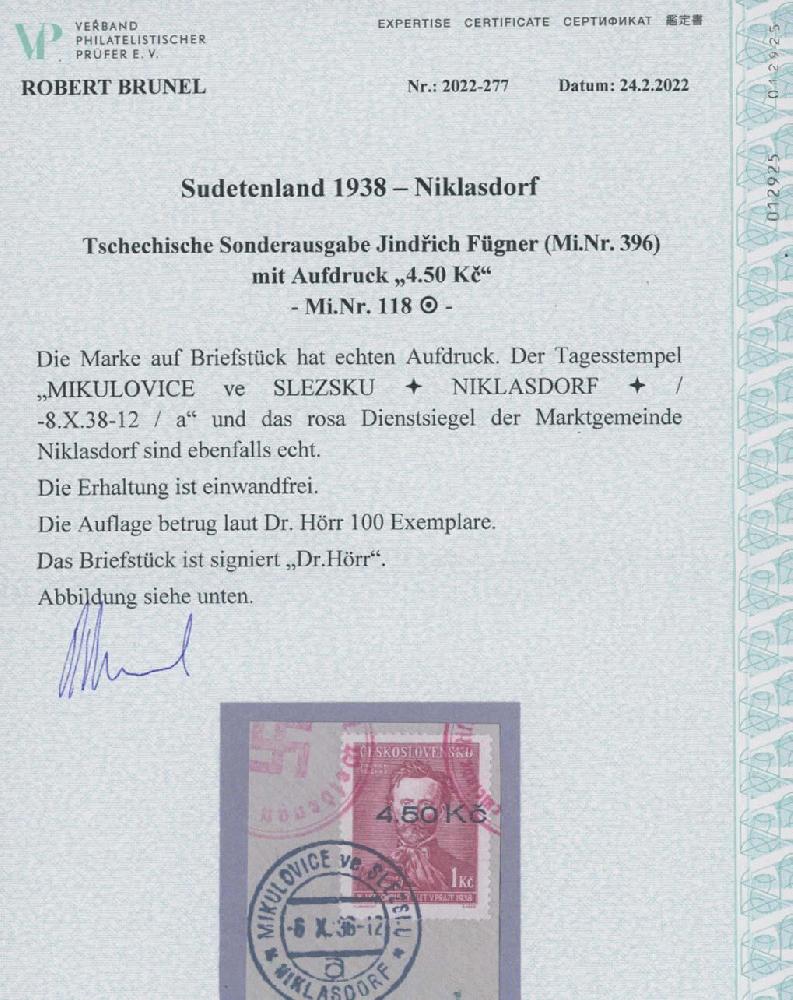 | Zusatzinformationen und Suchstichworte: | Ulrich Felzmann 175. Auktion Auktionstermin: 30. Juni 2022 Los 5765 Sudetenland Niklasdorf 4.50 Kc auf 1 Kc H Fügner mit voll aufsitzendem Tagesstempel 8.X.38 auf Pracht-Briefstück, sign. Dr. Hörr sowie Fotoattest Brunel "... einwandfrei" - Auflage nur 100 Exemplare Zuschlag 480,00 EUR |