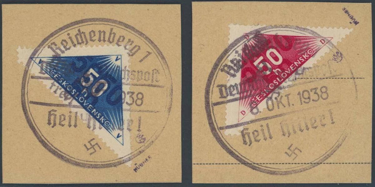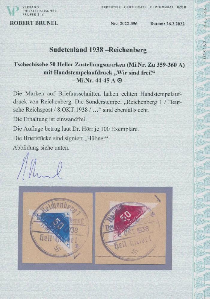 | Zusatzinformationen und Suchstichworte: | Ulrich Felzmann 175. Auktion Auktionstermin: 30. Juni 2022 Los 5776 Sudetenland Reichenberg Maffersdorf 50 H Zustellung, beide Dreiecksmarken in seltenerer Mischzähnung 13¾:13½:13¾ jeweils mit vollem SST 8.OKT.1938 auf Luxus-Briefstück, beide sign. Hübner sowie Fotoattest Brunel "... einwandfrei", € 1.000,- Zuschlag 360,00 EUR |
