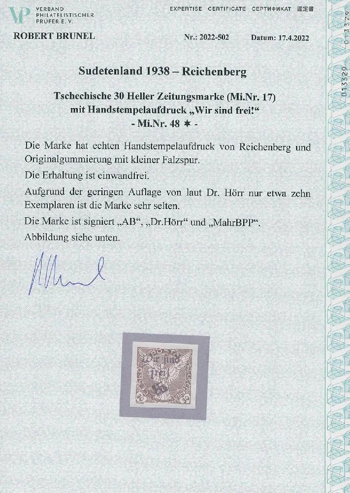 | Zusatzinformationen und Suchstichworte: | Ulrich Felzmann 175. Auktion Auktionstermin: 30. Juni 2022 Los 5778 Sudetenland Reichenberg Maffersdorf 30 H Zeitungsmarke ungebraucht mit minimaler Falzspur in breitrandiger Kabinetterhaltung, u.a. sign. Dr. Hörr und Mahr BPP sowie Fotoattest Brunel "... einwandfrei ... sehr selten" - Auflage nur etwa 10 Exemplare, € 4.000,- Ausruf 1.000,00 EUR |
