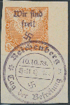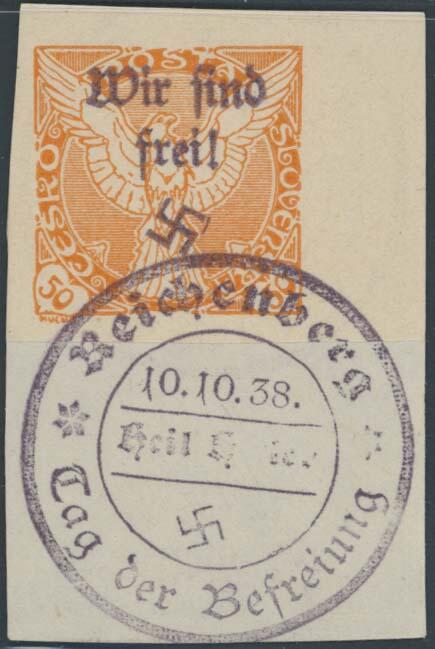 | Zusatzinformationen und Suchstichworte: | Ulrich Felzmann 175. Auktion Auktionstermin: 30. Juni 2022 Los 5781 Sudetenland Reichenberg Maffersdorf 50 H Zeitungsmarke, rechtes Randstück (!) mit voll aufsitzendem Befreiungsstempel 10.10.38 auf überaus attraktivem Luxus-Briefstück, doppelt sign. Krischke und Osper BPP sowie Fotoattest Brunel "... einwandfrei ... sehr selten" - Auflage nur etwa 10 Exemplare, € 3.500,- Zuschlag 1.1000,00 EUR |