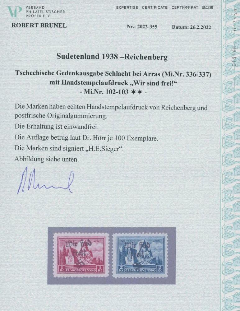| Zusatzinformationen und Suchstichworte: | Ulrich Felzmann 175. Auktion Auktionstermin: 30. Juni 2022 Los 5790 Sudetenland Reichenberg Maffersdorf 1 und 2 Kc Arras tadellos vollzähnig in postfrischer Top-Erhaltung, sign. Sieger sowie Fotoattest Brunel "... einwandfrei" - Auflage nur 100 Satz, € 800,- Zuschlag 660,00 EUR |