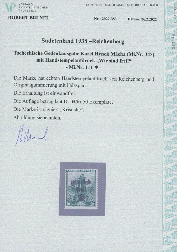 | Zusatzinformationen und Suchstichworte: | Ulrich Felzmann 175. Auktion Auktionstermin: 30. Juni 2022 Los 5792 Sudetenland Reichenberg Maffersdorf 50 H Macha ungebraucht in tadellos vollzähniger Prachterhaltung, sign. Krischke sowie Fotoattest Brunel "... einwandfrei" - Auflage nur 50 Exemplare, € 1.000,- Zuschlag 380,00 EUR |
