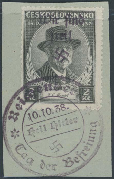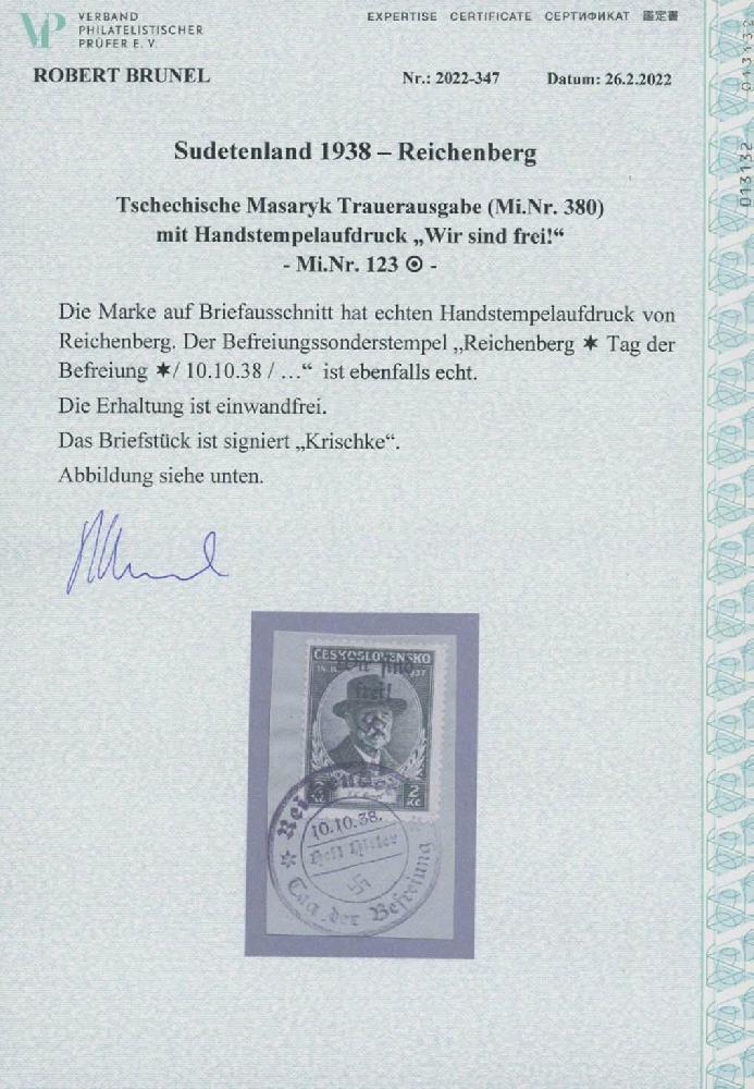 | Zusatzinformationen und Suchstichworte: | Ulrich Felzmann 175. Auktion Auktionstermin: 30. Juni 2022 Los 5795 Sudetenland Reichenberg Maffersdorf 2 Kc Masaryk Trauer, tadellos vollzähnig mit vollem Befreiungs-Stempel 10.10.38 auf Pracht-Briefstück, sign. Krischke sowie Fotoattest Brunel "... einwandfrei", € 1.000,- Zuschlag 320,00 EUR |