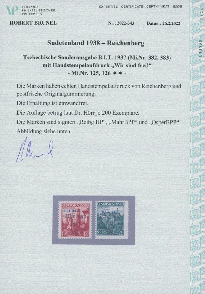 | Zusatzinformationen und Suchstichworte: | Ulrich Felzmann 175. Auktion Auktionstermin: 30. Juni 2022 Los 5796 Sudetenland Reichenberg Maffersdorf 1.50 und 2 Kc "B.I.T. 1937" je postfrisch, u.a. sign. Mahr BPP und Osper BPP sowie Fotoattest Brunel "... einwandfrei", € 600,- Zuschlag 500,00 EUR |