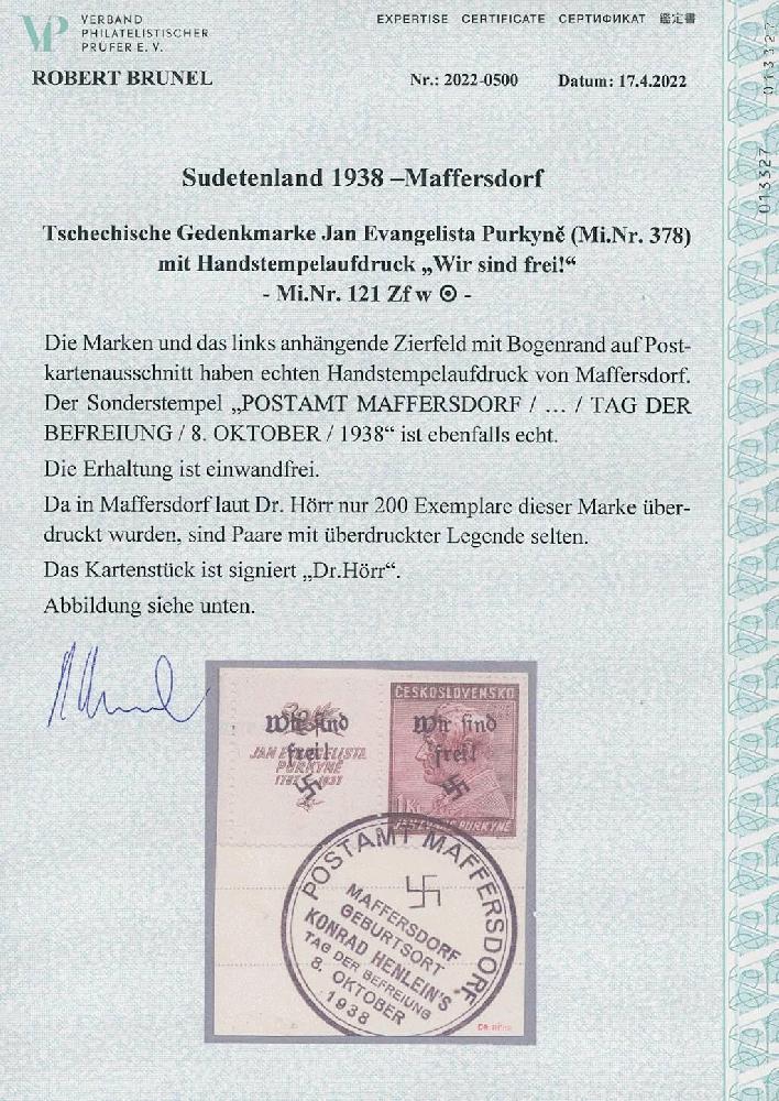 | Zusatzinformationen und Suchstichworte: | Ulrich Felzmann 175. Auktion Auktionstermin: 30. Juni 2022 Los 5813 Sudetenland Reichenberg Maffersdorf 1 Kc Purkyne mit links anhängendem, ebenfalls überdrucktem (!) Zierfeld, kleinem Bogenrand und vollem Befreiungs-Stempel auf attraktivem Pracht-Briefstück, u.a. sign. Dr. Hörr sowie Fotoattest Brunel "... einwandfrei ... selten", € 2.800,- Zuschlag 420,00 EUR |