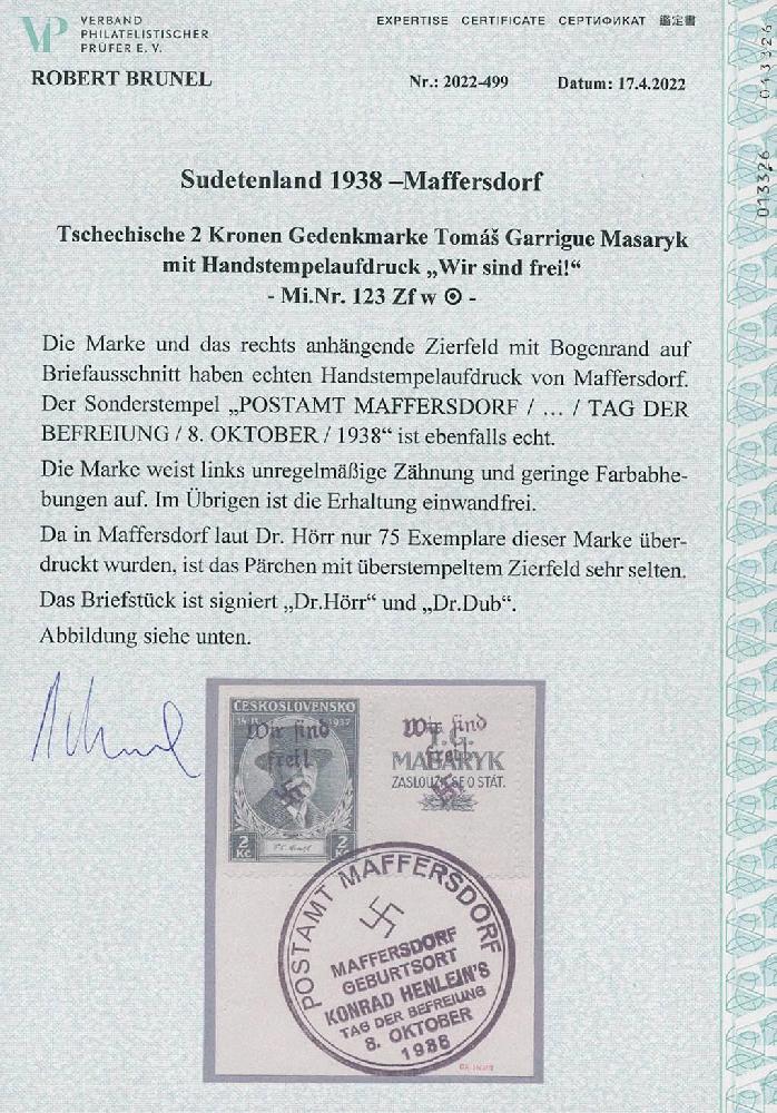 | Zusatzinformationen und Suchstichworte: | Ulrich Felzmann 175. Auktion Auktionstermin: 30. Juni 2022 Los 5814 Sudetenland Reichenberg Maffersdorf 2 Kc Masaryk Trauer mit rechts anhängendem, ebenfalls überdrucktem (!) Zierfeld sowie kleinem Bogenrand, linksseitig unregelmäßig gezähnt mit kleinen Farbabhebungen, darüber hinaus einwandfrei mit voll aufsitzendem Befreiungsstempel auf insgesamt sehr attraktivem Liebhaber-Briefstück, u.a. sign. Dr. Hörr sowie Fotoattest Brunel "... sehr selten", € 6.000,- Zuschlag 800,00 EUR |