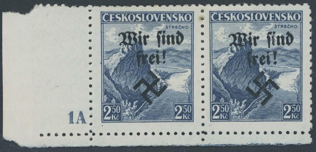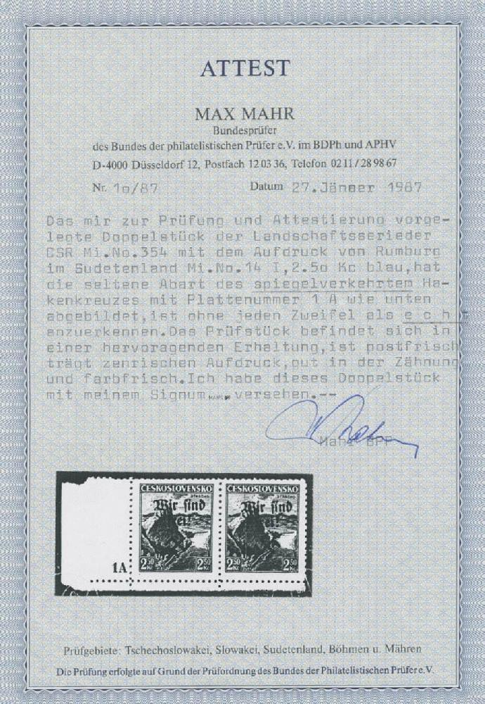 | Zusatzinformationen und Suchstichworte: | Ulrich Felzmann 175. Auktion Auktionstermin: 30. Juni 2022 Los 5824 Sudetenland Rumburg 2,50 Kc Strecno mit Aufdruckfehler "seitenverkehrtes Hakenkreuz" im waagerechten Paar mit Normalmarke, postfrische linke untere Bogenecke mit Plattennummer "1A" in tadelloser Luxuserhaltung! In dieser Kombination und Qualität wohl einmalige Einheit, sign. Mahr BPP mit Fotoattest "Das Prüfstück befindet sich in einer hervorragenden Erhaltung" Zuschlag 1.800,00 EUR |