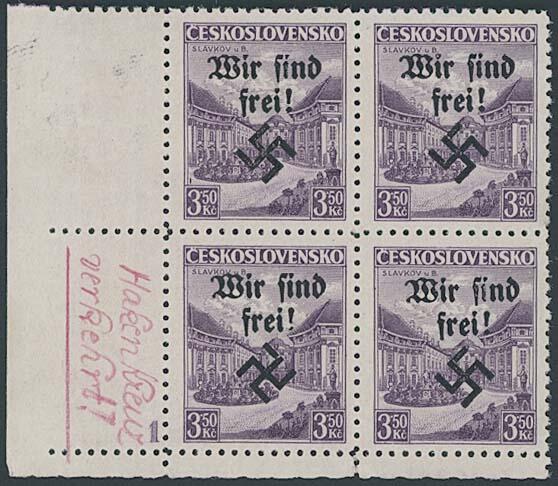 | Zusatzinformationen und Suchstichworte: | Ulrich Felzmann 175. Auktion Auktionstermin: 30. Juni 2022 Los 5827 Sudetenland Rumburg 3,50 Kc Austerlitz mit Aufdruckfehler "seitenverkehrtes Hakenkreuz", Feld 91 innerhalb eines postfrischen Eckrand-Viererblocks links unten, Falzrest lediglich im linken oberen Randstück, darunter entsprechende Hinweis-Beschriftung, dort zudem die Plattennummer "1"! U.a. sign. Mahr BPP mit Fotoattest sowie Fotoattest Brunel " ... einwandfrei ... äußerst selten" - Auflage gemäß Dr. Hörr nur etwa 5 Exemplare Ausruf 2.000,00 EUR |
