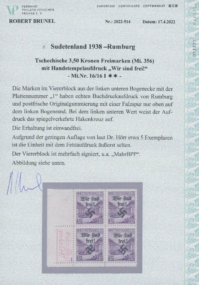 | Zusatzinformationen und Suchstichworte: | Ulrich Felzmann 175. Auktion Auktionstermin: 30. Juni 2022 Los 5827 Sudetenland Rumburg 3,50 Kc Austerlitz mit Aufdruckfehler "seitenverkehrtes Hakenkreuz", Feld 91 innerhalb eines postfrischen Eckrand-Viererblocks links unten, Falzrest lediglich im linken oberen Randstück, darunter entsprechende Hinweis-Beschriftung, dort zudem die Plattennummer "1"! U.a. sign. Mahr BPP mit Fotoattest sowie Fotoattest Brunel " ... einwandfrei ... äußerst selten" - Auflage gemäß Dr. Hörr nur etwa 5 Exemplare Ausruf 2.000,00 EUR |