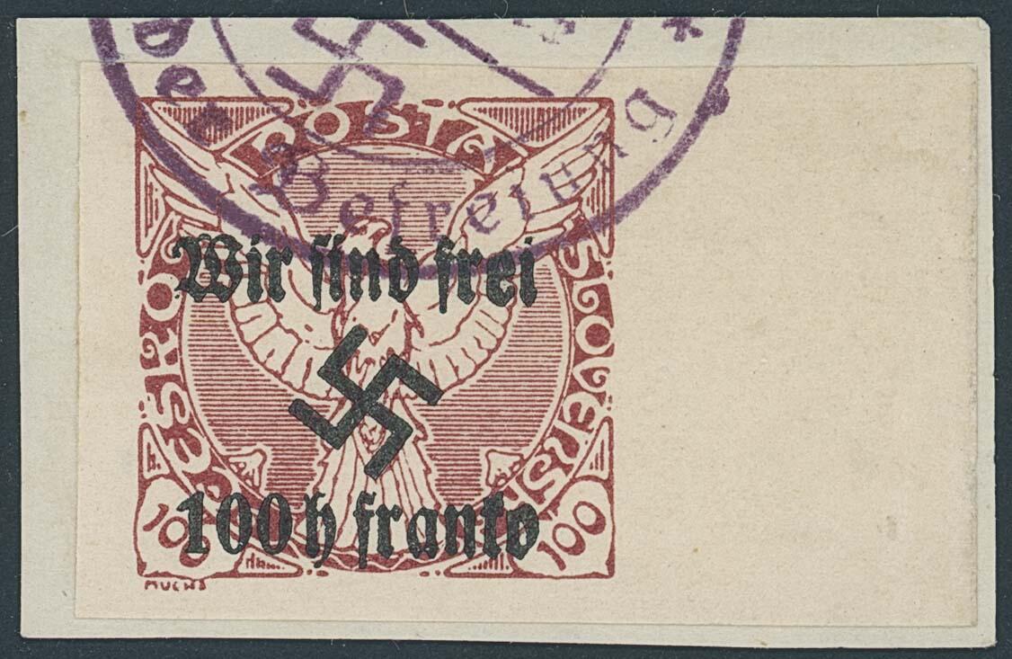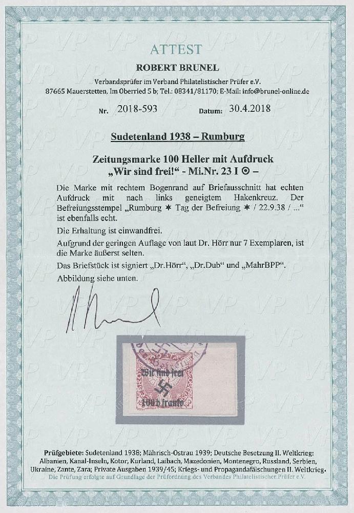 | Zusatzinformationen und Suchstichworte: | Ulrich Felzmann 175. Auktion Auktionstermin: 30. Juni 2022 Los 5833 Sudetenland Rumburg 100 auf 100 H Falke mit geneigtem Hakenkreuz, Randstück mit klarem Teilabschlag des Befreiungsstempels auf Pracht-Briefstück, u.a. sign. Mahr BPP sowie Fotoattest Brunel "... einwandfrei" - Abbildungsstück im Handbuch Späth, 2019, S. 380 Zuschlag 3.600,00 EUR |