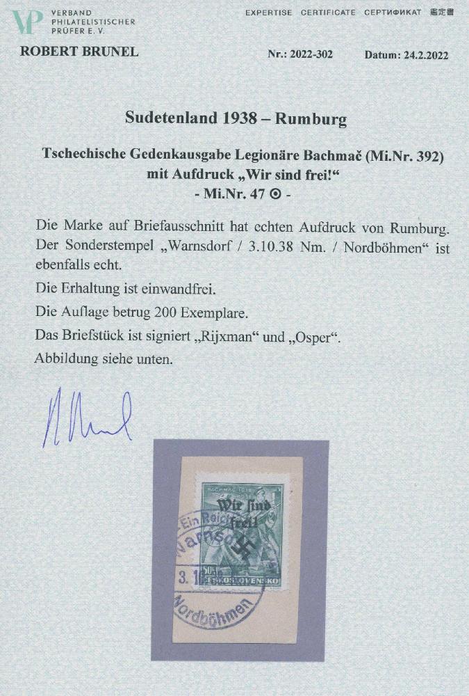 | Zusatzinformationen und Suchstichworte: | Ulrich Felzmann 175. Auktion Auktionstermin: 30. Juni 2022 Los 5839 Sudetenland Rumburg 50 H Bachmatsch mit nahezu vollem SST WARNSDORF 3.10.38 auf Pracht-Briefstück, sign. Rijxman und Osper sowie Fotoattest Brunel "... einwandfrei", € 2.000,- Ausruf 500,00 EUR |