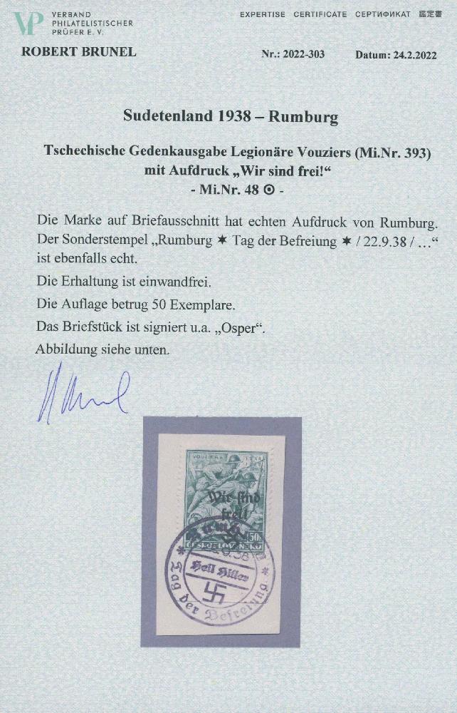 | Zusatzinformationen und Suchstichworte: | Ulrich Felzmann 175. Auktion Auktionstermin: 30. Juni 2022 Los 5840 Sudetenland Rumburg 50 H Vouziers, perfekt vollzähniges Unterrandstück (!) mit voll aufsitzendem Befreiungsstempel auf Luxus-Briefstück, sign. Dr. Hörr und Osper sowie Fotoattest Brunel "... einwandfrei" - Auflage nur 50 Exemplare, € 4.000,- Zuschlag 900,00 EUR |